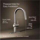 KOHLER’s DockNetik® magnetic docking system ensures the spray head glides back into place effortlessly and stays securely docked when not in use. The ProMotion® technology further enhances the faucet’s usability by incorporating a light, quiet braided hose and swiveling ball joint, allowing the spray head to move with exceptional ease and flexibility. Meanwhile, the MasterClean™ spray face is designed to resist mineral buildup and is easy to wipe clean, ensuring long-term performance and minimal maintenance.